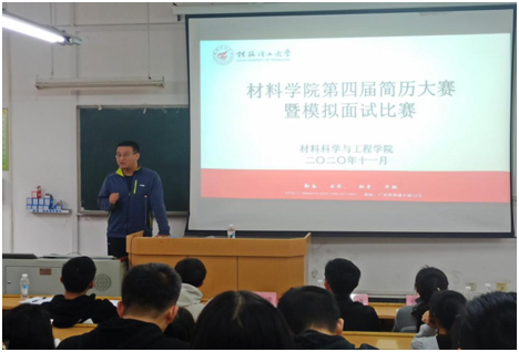 2020年11月3日下午,材料学院第四届简历设计暨模拟面试大赛在屏风校区9115教室举办,学院学工组长单江涛、部分辅导员和学生代表担任本次大赛的评委,2017级部分同学参加了本次活动。