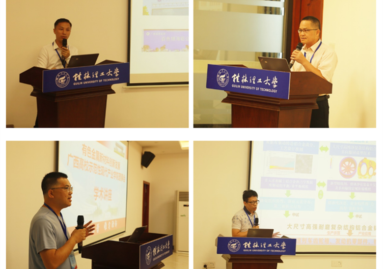 在产业学院建设发展研讨会阶段,广西南南铝加工有限公司热轧技术站站长兼船舶材料研究所副所长赵启忠、广西特钢新材料重点实验室主任及广西北港新材料有限公司技术中心副主任黄学忠、中国有色桂林矿产地质研究院有限公司生态环境研究所固废处理中心主任冯吉福和桂林理工大学材料科学与工程学院教授喻亮共四位专家分别做了海洋工程用耐蚀5系铝合金板材制备技术研究、在线轧退洗一体化生产高品质不锈钢带关键共性技术研发应用、广西某低品位氧化锌矿浮选研究和双联通结构Al2O3 3D/Al复合材料的耐磨及耐蚀性能的学术报告。