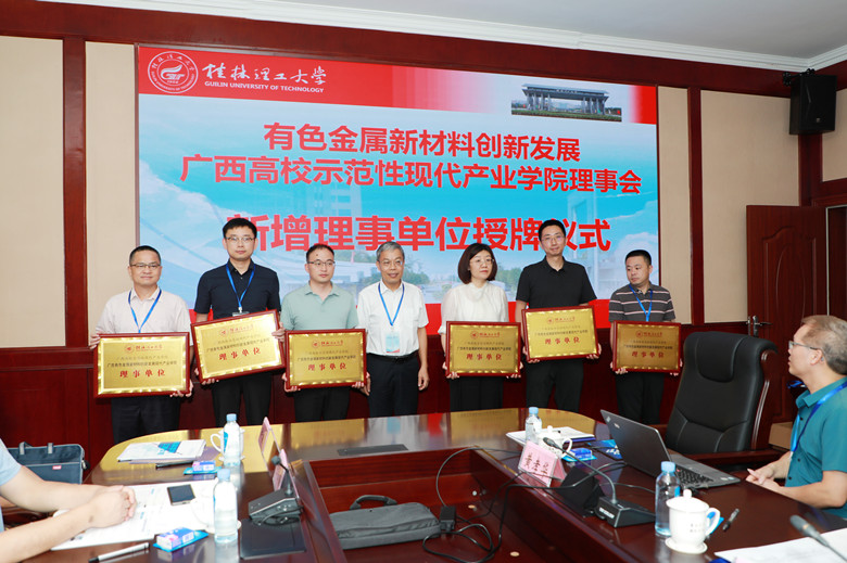 黎贞崇在理事会第二次会议上致辞。他首先对本次会议的召开表示热烈祝贺,并向各位理事单位、各位嘉宾莅临会议表示诚挚感谢。他简要介绍了学校的基本情况,总结了产业学院建立以来在产教融合、人才培养、成果转化三个方面所取得的建设成效,并期盼通过本次会议能够汇聚各企业单位的智慧与力量,对现代产业学院下一步的建设发展进行更深、更广的战略性谋划和布局,尽快把学院建成立足广西、面向华南、辐射全国的有色金属新材料示范性产学研合作平台,为赋能国家和区域高质量发展贡献力量。随后,黎贞崇为新增加的9家理事单位进行授牌。