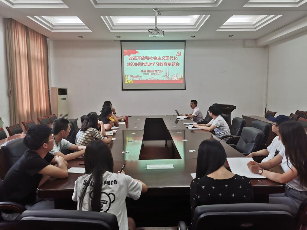 为深入学习贯彻习近平新时代中国特色社会主义思想,不断从党的百年奋斗历史中,汲取继续前进的智慧和力量。6月8日中午,学院研究生第四党支部在3212会议室召开了改革开放和社会主义现代化建设新时期党史学习教育专题会。支部全体党员参加,专题会由支部书记李俊俊同志主持。