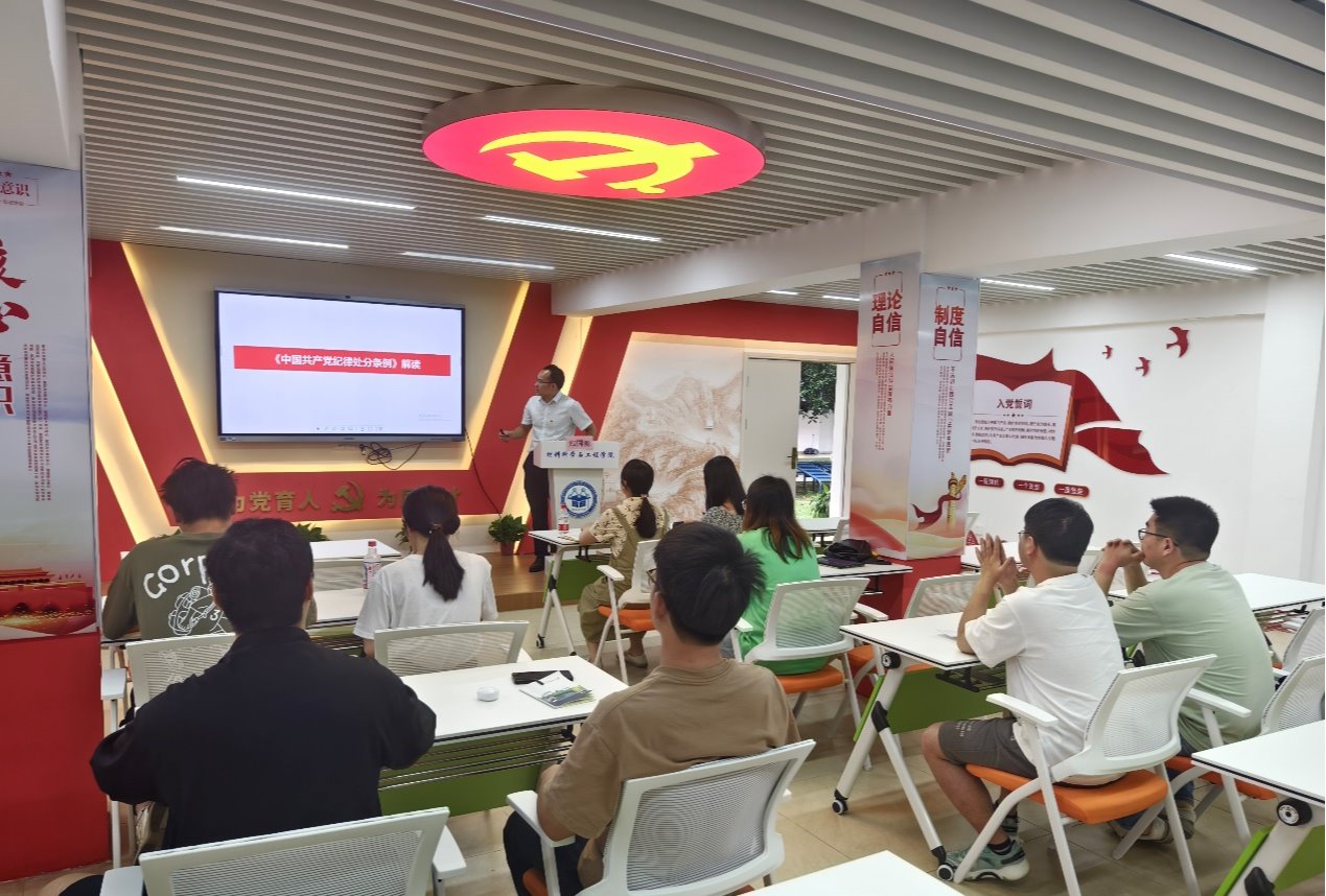 2024年5月28日,学院党委委员郑国源老师在材苑“一站式”学生社区思政大讲堂为研究生第七党支部全体党员上专题党课,解读《中国共产党纪律处分条例》。