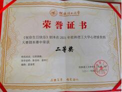 4月27日,经过精心编排、院内选拔以及现场激烈角逐,我院的心理情景剧作品《祝你生日快乐》荣获桂林理工大学2021心理情景剧大赛二等奖。《祝你生日快乐》剧本在2021年桂林理工大学心理情景剧本赛中荣获二等奖。