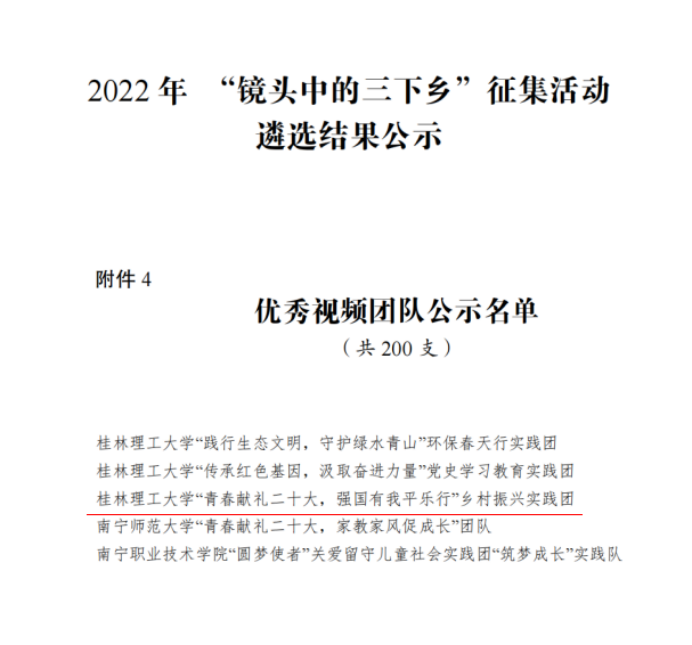 在团中央青年发展部、中国青年报社、中国青年网共同举办的2022年全国大中专学生志愿者暑期“三下乡”社会实践“镜头中的三下乡” 成果遴选活动中,我院“青春献礼二十大,乡村振兴平乐行”社会实践团荣获“镜头中的三下乡”全国优秀视频报道团队。