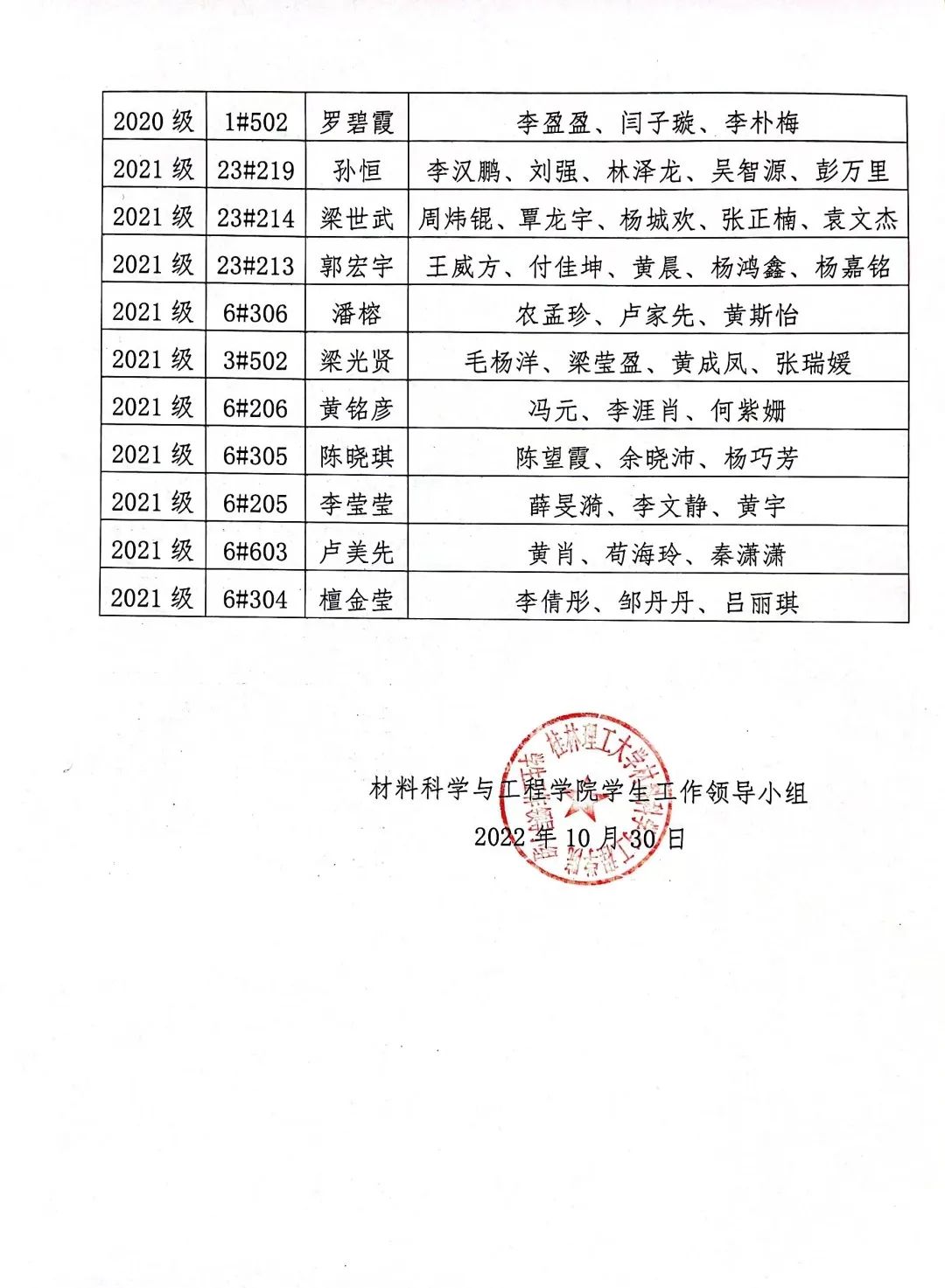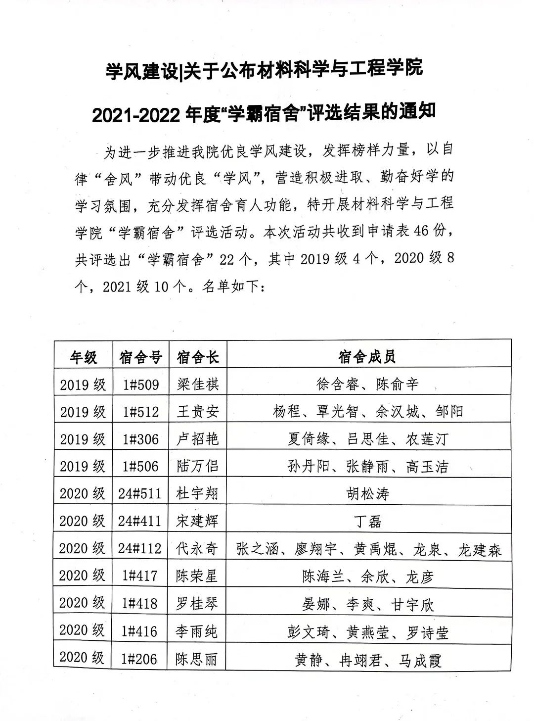 为进一步推进我院优良学风建设,发挥榜样力量,以自律“舍风”带动优良“学风”,营造积极进取、勤奋好学的学习氛围,充分发挥宿舍育人功能,特开展材料科学与工程学院“学霸宿舍”评选活动。本次活动共收到申请表46份,共评选出“学霸宿舍”22个,其中2019级4个,2020级8个,2021级10个。名单如下: