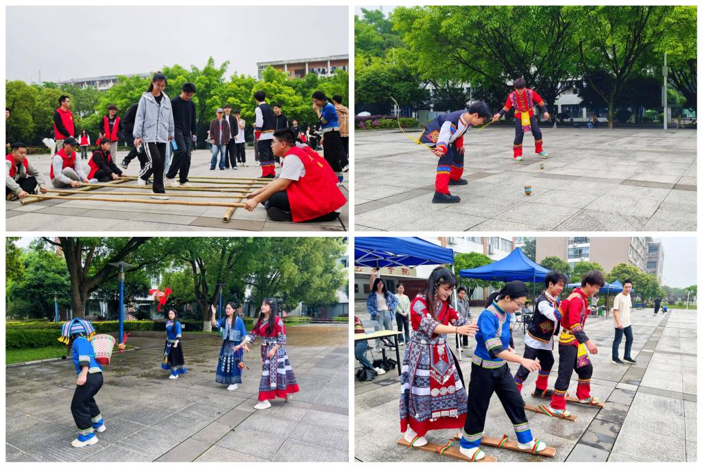 一花独放不是春,百花齐放春满园。本次民俗文化体验活动设置了竹竿舞、抛绣球、射箭挑战、打陀螺、走板鞋等五个项目,通过“文化体验+趣味竞技”的形式展开,吸引了500余名学生的热情参与。大家踩着音乐鼓点、伴随着竹竿开合节奏跳跃,展现了出色的协调能力;两人搭档,相互配合,将绣球精准抛入背篓;开弓、瞄准、脱弦,一气呵成,让箭矢直奔靶心;三人成队,共同驾驭板鞋,喊着“一二一”,在赛道上穿梭;一手握杆、一手举陀螺,将缠绕陀螺的长线用力一抽,陀螺瞬间飞速旋转,赢得阵阵喝彩,每一个项目都让同学们体验感满满,欢乐加倍。这些活动不仅考验了同学们的技巧和力量、协调性和节奏感,也让他们深切感受到了这些传统民俗活动的艺术性和趣味性。