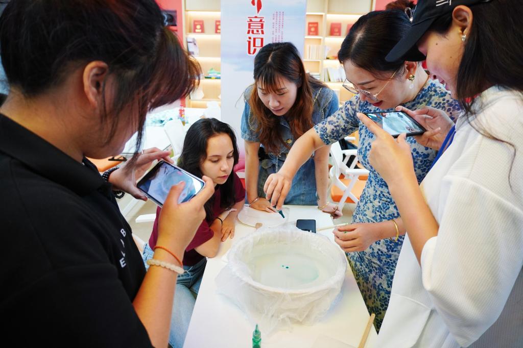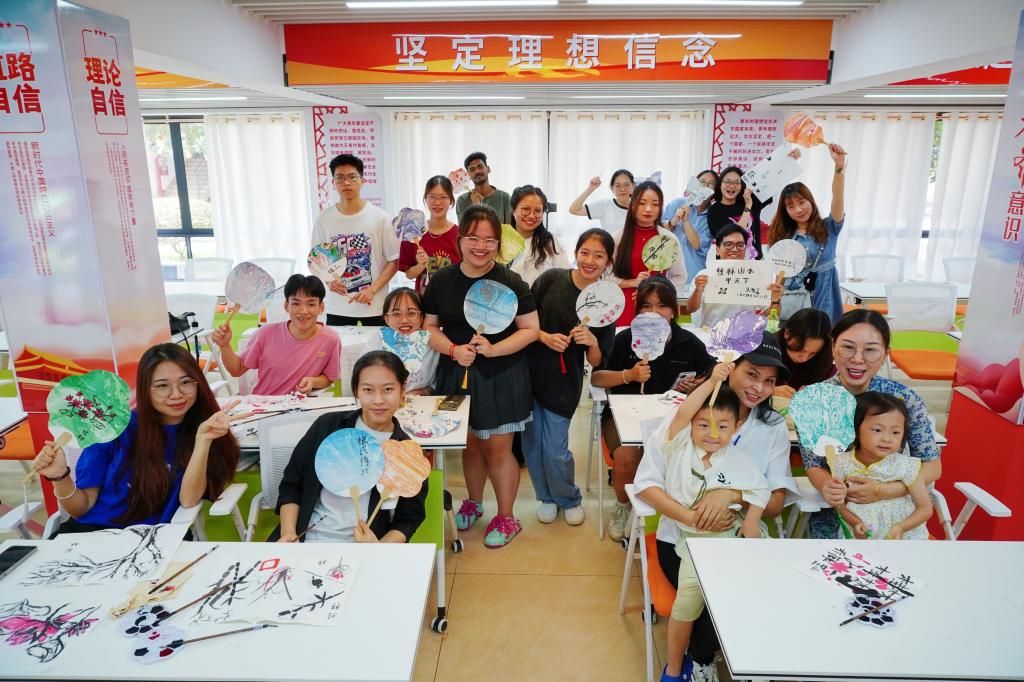 古绘宣讲团讲解员赵晨健同学首先围绕中国山水画的历史背景、艺术特点和形式美感等方面对中国山水画的悠久历史和深厚底蕴进行了生动讲解,使在场师生对中国画的艺术特色有了更加直观的认识。随后,讲解员通过现场演示,从形神、笔墨、色彩和形制四个方面详细解析了中国山水画的精髓,让同学们对中国山水画的艺术语言和审美价值有了更深层次的理解。随后,现场的留学生们在老师的指导下动手尝试毛笔书写与绘画,从简单的线条练习到构图创作,体验了中国书法的韵味与绘画的乐趣。漆扇制作环节将活动推向了高潮,留学生们争先参与漆扇制作,绘制属于自己的漆扇,在扇面写下期望与祝福。师生们纷纷表示,这是一次令人难忘的文化体验活动,让他们切实感受到了中国传统工艺的精湛技艺与细腻匠心,使他们对中华文化有了更加深刻的理解和感悟,希望未来能有更多这样的文化交流机会,增进对中华文化的了解和认同。