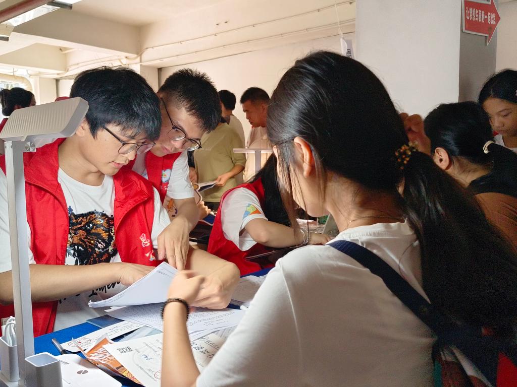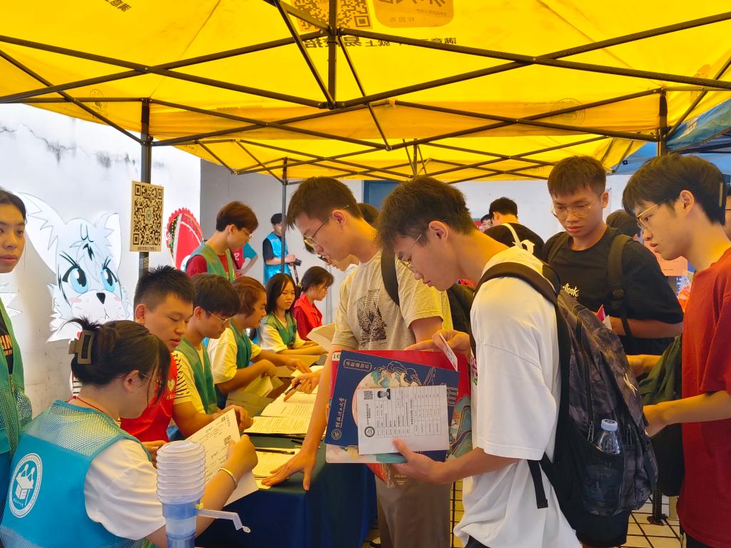 志愿者在6栋迎新点迎接新生