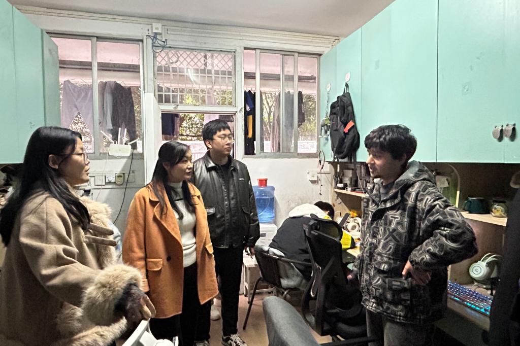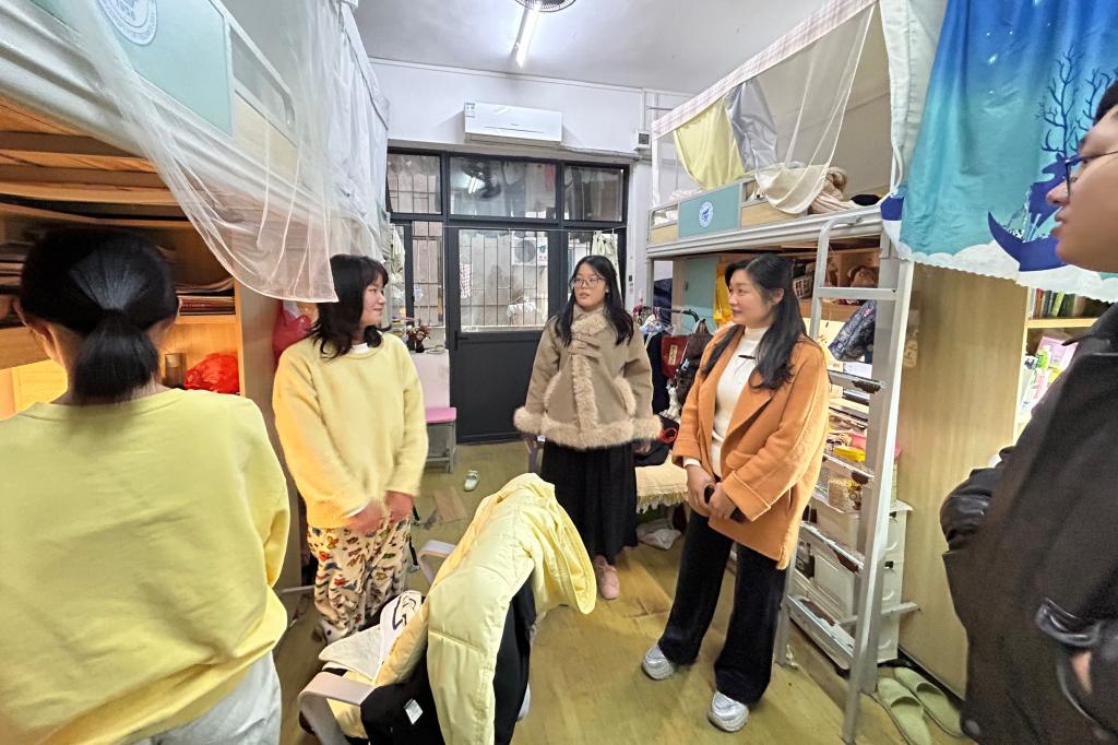 走访过程中,蒋琼一行重点检查了宿舍用电安全、消防通道及设施配置等情况,提醒同学们切实增强安全意识,自觉遵守宿舍管理规定,杜绝违规用电行为。针对部分宿舍存在内务杂乱、物品堆放无序等情况,老师们耐心引导同学们做好日常整理,共同维护整洁、有序、文明的居住环境。