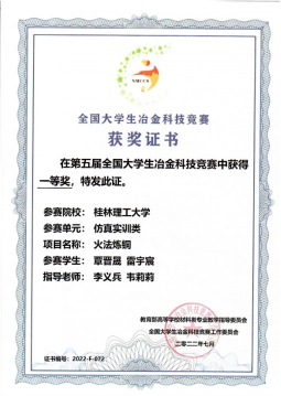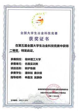 在我院冶金与金属材料工程教研室老师的精心指导下,代表桂林理工大学参赛共6项作品闯入决赛,经集中会评和终评答辩,最终科技创新竞赛单元获得二等奖2项,三等奖4项,仿真实训类的四支队伍全部获奖,其中转炉炼铜分别荣获大赛的一等奖、二等奖各一项,转炉炼钢荣获二等奖、三等奖各一项,为桂林理工大学争得了荣誉。体现了材料学院学子的综合素质和技能水平,也是对学院、学校办学特色和办学优势的最好诠释。